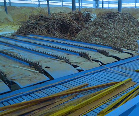 Сначала роликовый конвейер транспортирует высушенную древесную щепу из буферного силоса на ленточный конвейер, затем древесная щепа равномерно транспортируется ленточным конвейером в двухроторную молотковую дробилку, где измельчается, после чего измельченный порошок поступает в циклон.